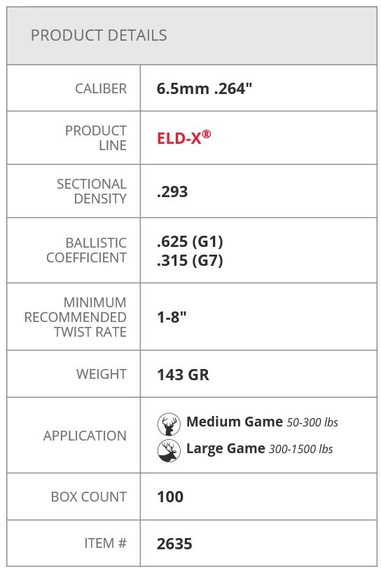 The ELD-X® (Extremely Low Drag – eXpanding) bullet is a technologically advanced, match accurate, ALL-RANGE hunting bullet featuring highest-in-class ballistic coefficients and consistent, controlled expansion at ALL practical hunting distances.