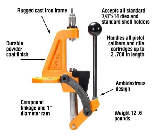 Lyman’s Brass-Smith Ideal Press is the perfect starting point for beginners or as a precision companion press for experienced reloaders. The compact design of the Ideal Press requires minimal bench space, but it is not some flimsy lightweight! The rugged press frame is made of cast iron, while other components are all steel.  The press features compound linkage for optimum leverage, a 1” diameter ram, and a 3 7/8” press opening which can handle all pistol calibers and rifle cartridges with a loaded length of up to 3.700”. The press has a central handle position for easy ambidextrous use and a ball handle for comfortable operation. The Ideal Press accepts all 7/8×14 thread dies and standard shell holders. The press will provide accuracy and precision for beginners or experts, and is the perfect auxiliary press for those wishing to perform a specific operation separate from their main press.